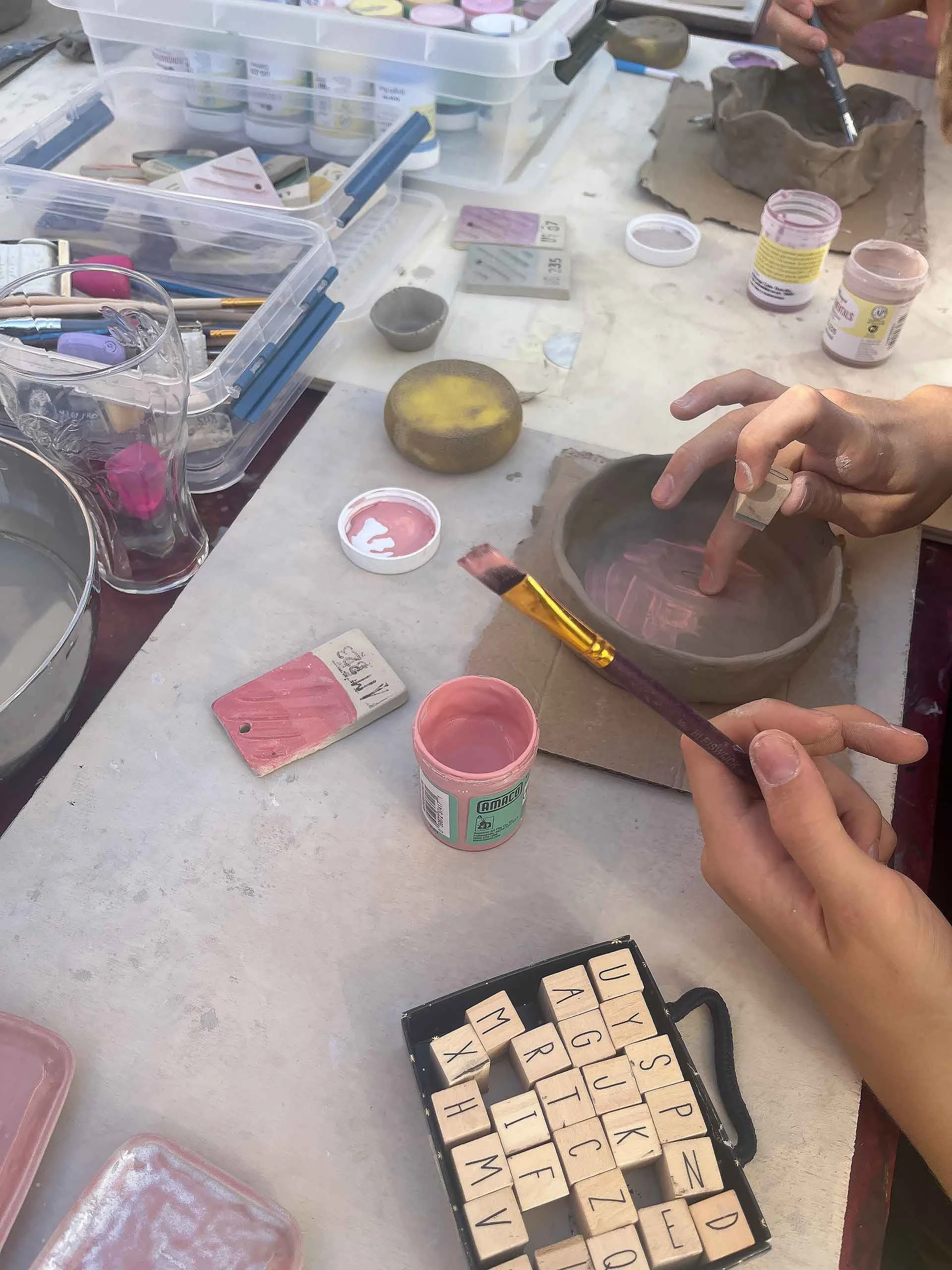 Ik leer hen hoe ze met verschillende technieken een kommetje of tasje kunnen maken. Na het opbouwen moeten deze even drogen en daarna kunnen ze beschilderd worden.